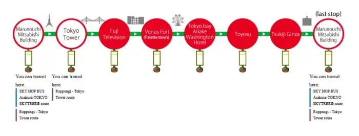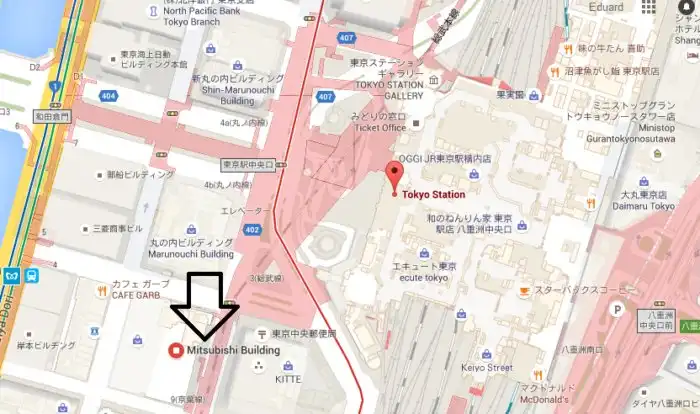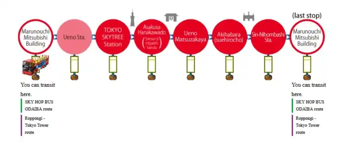 Центральная остановка Sky Hop Bus находится в очень удобном месте, у главного вокзала Tokyo Station (выход Marunouchi South Exit), у здания Marunouchi Mitsubishi Building. Там же на первом этаже кассы.