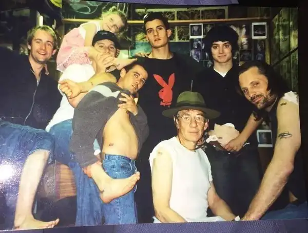 Фотография со съемок фильма "Властелин колец". Похоже, что сделана она была, после того как практически весь актерский состав сделал тату в честь фильма, 2000 год