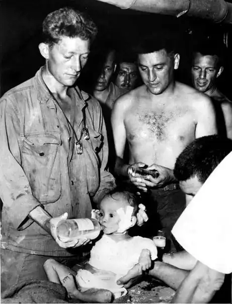 Американские солдаты ухаживают за филиппинским младенцем, пострадавшим от удара штыком в лицо. Филиппины, ноябрь 1944 года