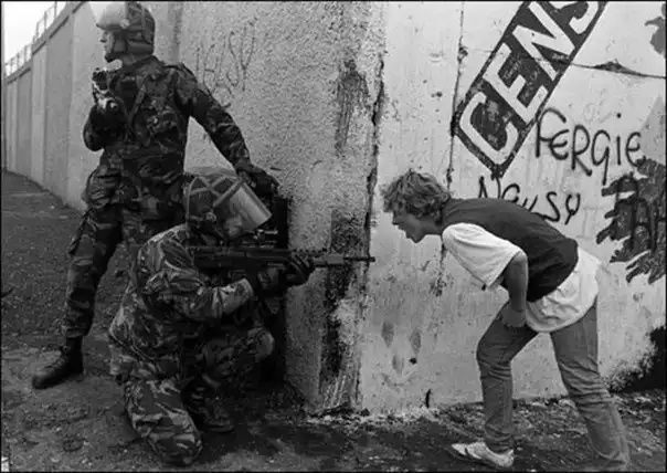 Ирландский подросток кричит на британских солдат во время беспорядков в Северной Ирландии, 1980-е