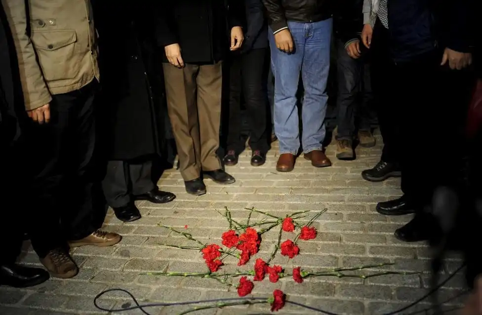 Люди приносят цветы к медицинскому центру в Стамбуле. На этом месте погибло от взрыва 10 человек.