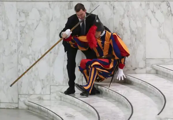 Страж заболел и Поп Фрэнсис помогает ему дойти до Ватикана.