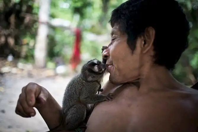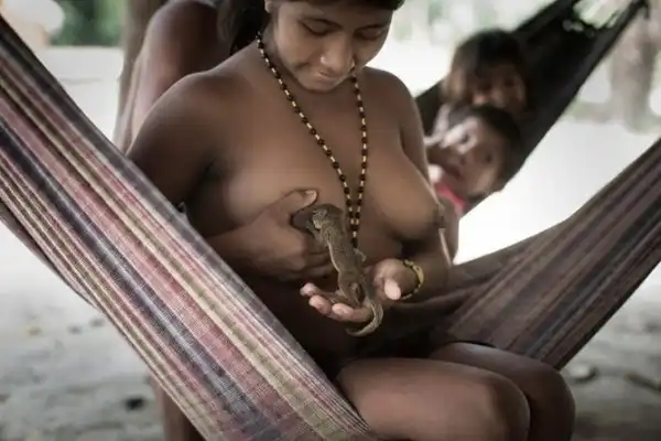 Дело в том, что женщины этого племени, кроме собственных малышей выкармливают грудью разных диких животных, в частности белок. Практически у каждой семьи в племени ава есть прирученное домашнее животное, которое мать семейства кормит грудью, пока зверек не вырастет. Животных, выросших на грудном вскармливании, Ава не употребляют в пищу. Фотограф Доменико Пульезе делится наблюдениями: "Они кормят белок и обезьян точно так же, как кормят своих детей, - грудью. Они так близки к природе. На самом деле даже не близки - они являются частью природы! Глядя на обычаи и образ жизни этой народности, тебя вдруг осеняет и ты понимаешь, как далеко мы продвинулись..."
