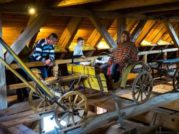 В бывшем каретном дворе представлены самые различные приспособления, использовавшиеся совместно с конной тягой. Например, вот такой каменный каток…