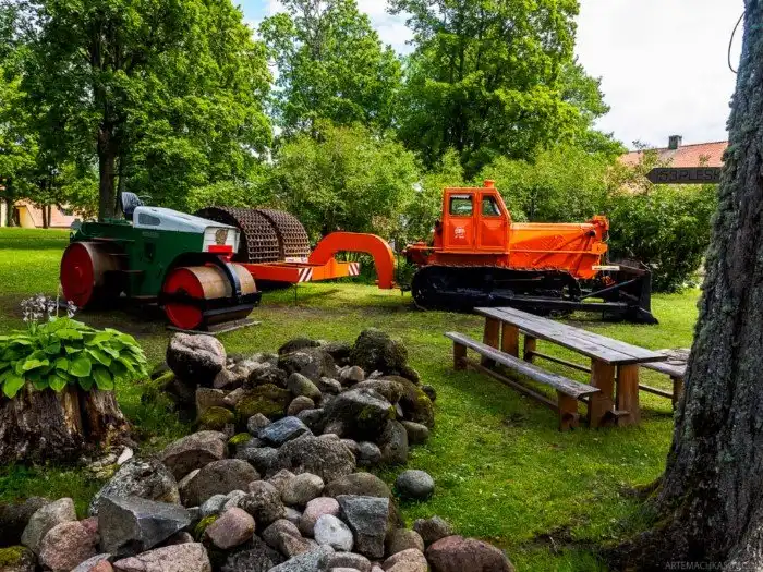 Уютный внутренний двор и постройки усадьбы стали местом расположения наиболее крупных экспонатов Латвийского дорожного музея.