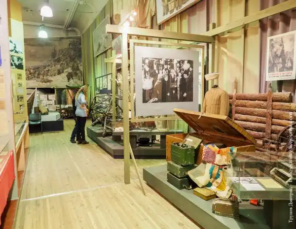Попадая в основной зал музея вы попадаете в выставочную зону. В момент моего присутствия посетители могли изучить выставку «Салют Победы», которая рассказывает о последних днях Великой Отечественной войны и первых послевоенных месяцах.
