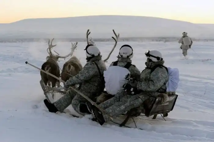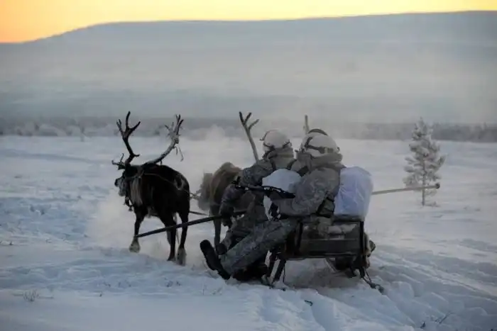 На официальной странице Министерства обороны РФ в Facebook опубликованы снимки процесса отработки тактических элементов рейдовых действий в арктических условиях. Военнослужащие разведывательной роты отдельной арктической мотострелковой бригады Северного флота учились управлять собачьими и оленьими упряжками. Так как все происходило в 30-градусный мороз, то после занятий разведчики погрелись в чуме у огня .