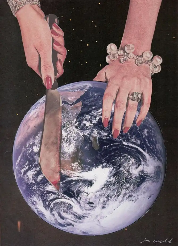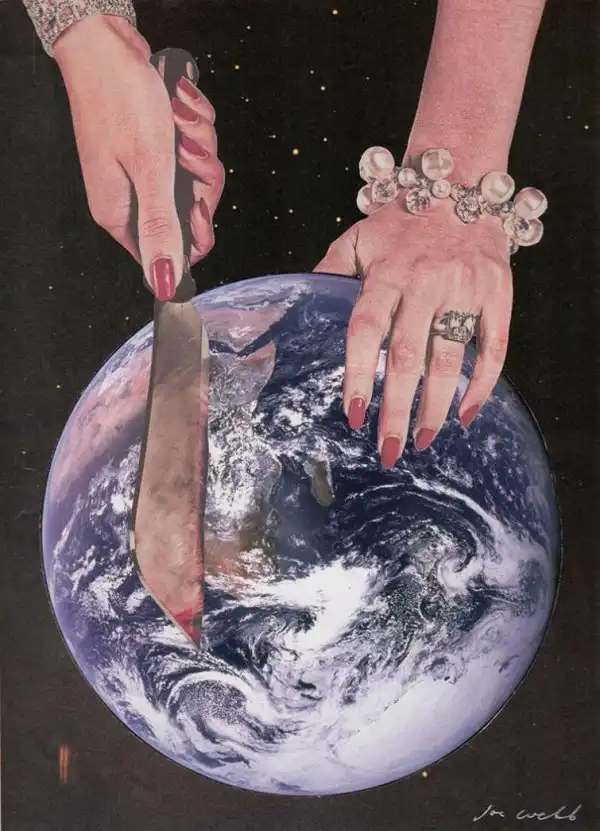 Британский художник Джо Уэбб создает свои сатирические коллажи вручную, совмещая фотографии, которые он вырезает из старых журналов. В своих коллажах Джо объединяет в одно мир высокой моды и роскошь, с бедностью, войнами и экологическими бедствиями. В своих мощных работах художник отражает неравенство, несправедливость, противоречия и парадоксы современного мира, которые для многих глаз остаются невидимыми.