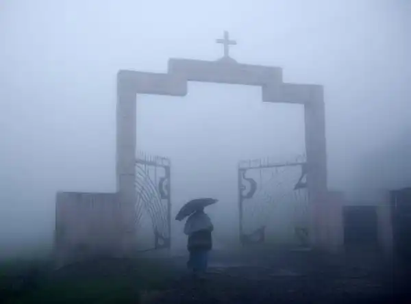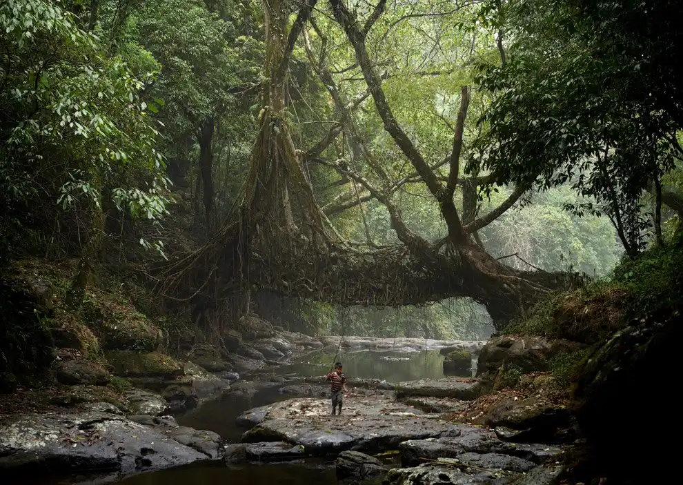 Штат Мегхала́я, Индия. В горах Восточные Кхаси находится городок Мосинрем, известный как самое дождливое место на Земле. Годовая норма осадков здесь превышает 11 870 мм. Люди, которые работают на открытом воздухе, часто носят необычные огромные зонтики, закрывающие все тело и сделанные из бамбука и листьев банана. Одной из самых интересных и красивых особенностей в регионе являются «живые мосты» из каучуковых деревьев, которые, в отличие от обычных мостов, с течением времени, из-за развития корневой системы становятся все крепче и крепче.