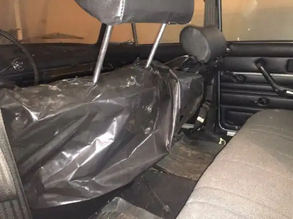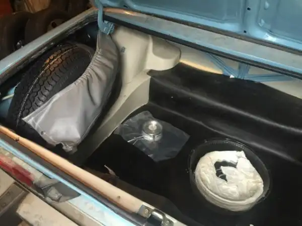 В багажнике - новая запаска, баночка с краской и 4 новых хромированных колпака, завернутые в бумагу.