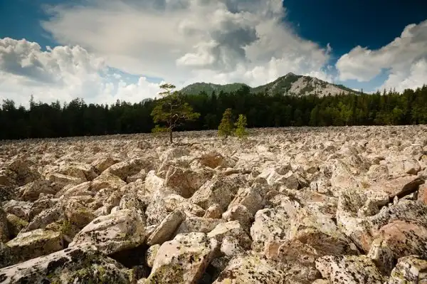 У подножия утесов Таганая находится еще одна природная достопримечательность – каменные реки. Это редкое природное явление представляет собой хаотическое нагромождение каменных глыб, которые, словно исполинские капли, застыли в потоке, спускаясь по склонам гор. Самая длинная каменная река тянется на 5-6 километров, “протекая” между горой Двуглавая сопка и Средним Таганаем. В основном она состоит из авантюрина – разновидности кварцита. Это месторождение является гордостью и достоянием страны, тем более что равное ему по красоте и размерам камней есть только в Индии и больше нигде на планете.