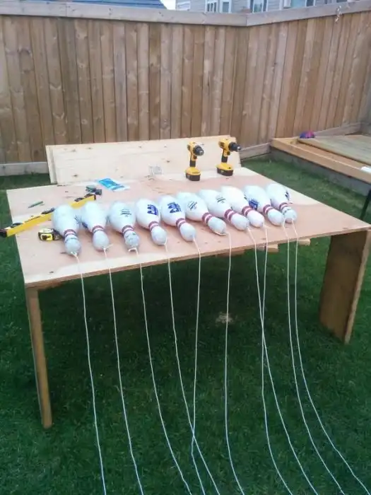 Любитель игры в боулинг решил играть в любимую игры на заднем дворе своего дома. Для этого он сконструировал свою дорожку и даже придумал нехитрое приспособление, поднимающее кегли.