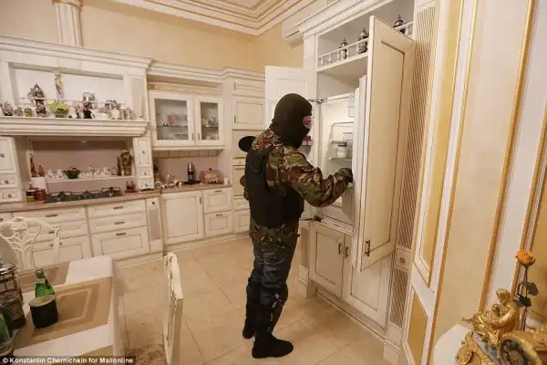 Издание опубликовало фотографии интерьера дворца на момент, когда активисты только вошли в него (февраль 2014 года), и кадры из особняка спустя два года после революции. Авторы материала с удивлением отмечают, что разворовано практически все от бытовой техники и мебели до плитки в ванной комнате, ковров и даже дверных рам. Остались только диски для караоке и фотоальбом.