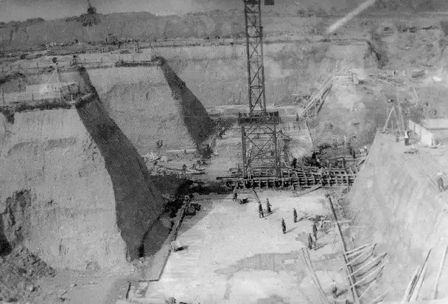 1948. Бетонирование нижней плиты фундамента: Проектирование было еще далеко не закончено, как уже начались строительные работы «нулевого цикла». Инженеры-конструкторы и архитекторы В.Н.Насонов и Н.В.Никитин блестяще решили эту «фундаментальную» задачу с помощью закона Архимеда: вес здания должен быть равен весу вынутой глины – чтобы «давление здания на грунт оставалось близким к давлению, которое испытывали грунты на этой глубине от снятых слоёв пород в условиях из естественного залегания».