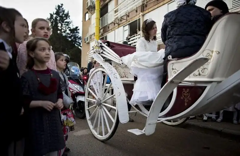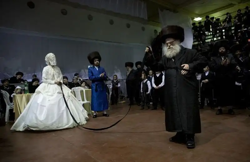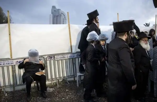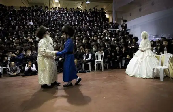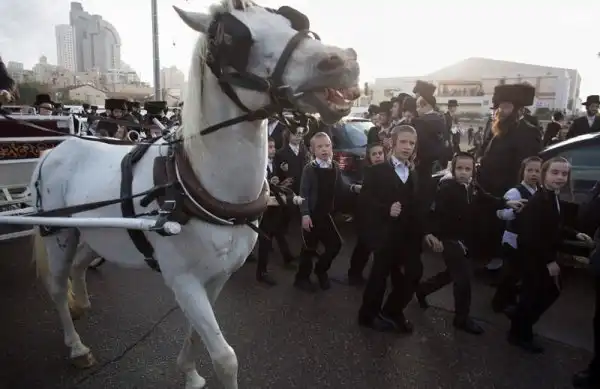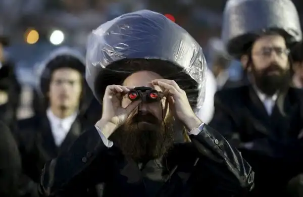 На крупнейшем курорте Израиля, городе Нетания, состоялось грандиозное празднество - свадьба внука раввина хасидской династии. На улице собрались тысячи людей, дабы посмотреть на церемонию бракосочетания, проводившуюся по древним обычаям, и поздравить молодоженов. Учитывая такую ораву гостей, неудивительно, что некоторые приглашенные заблаговременно запаслись биноклями. Примечательно, что предусмотрительные евреи даже пакеты с собой прихватили - прикрыть от дождя свой штраймл, то бишь головной убор для особо торжественных случаев.
