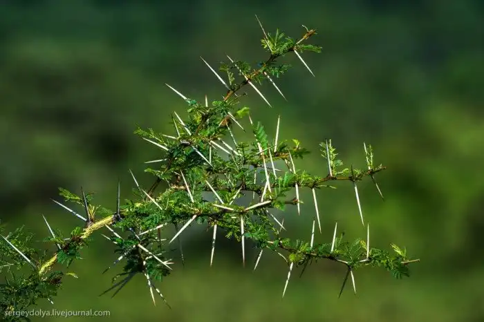 Дерево называется «африканской зубочисткой». У него такие колючки, что ни одно травоядное животное не рискнет щипать с веток листья (кроме, разве что, жирафов, у которых длинный и проворный язык):
