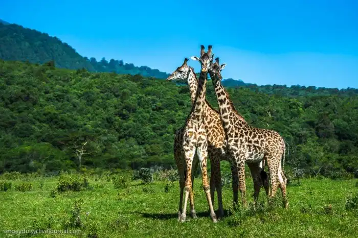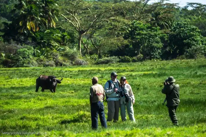 Самое крутое сафари в Танзании – это, безусловно, Нгоронгоро. Но оно не единственное. В Аруше, например, есть возможность вылезти из автомобиля и погулять среди животных. Ну, не прямо так чтобы путаться в ногах у жирафа, а на почтительном расстоянии. И для безопасности вас будет сопровождать рейнджер с АК-47 наперевес. Но тем не менее, опыт небезынтересный…