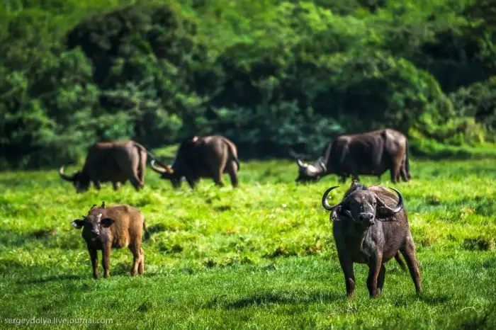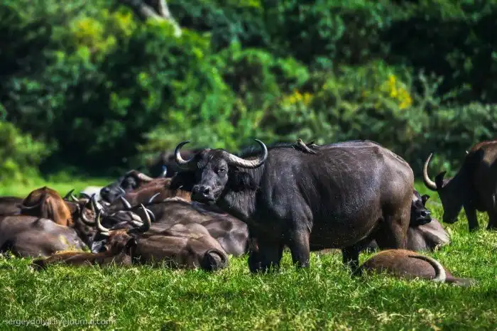 А вот приближаться к буйволам опасно. Мы медленно проходили мимо них по касательной. Совершенно не хочется оказаться на этих рогах: