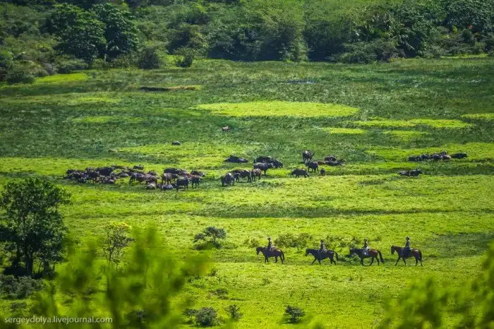 У подножия проходит конная экскурсия на фоне стада буйволов: