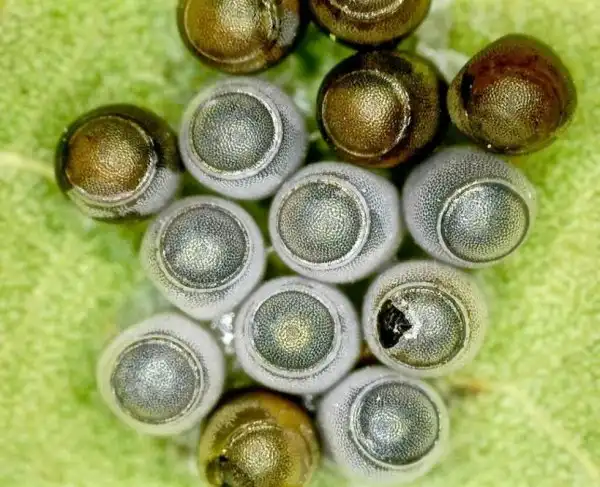 Нет, это не бриллианты, а кладка яиц клопа "Коричневый мраморный щитник" на листе осины. Из одного из яиц уже выбирается личинка насекомого