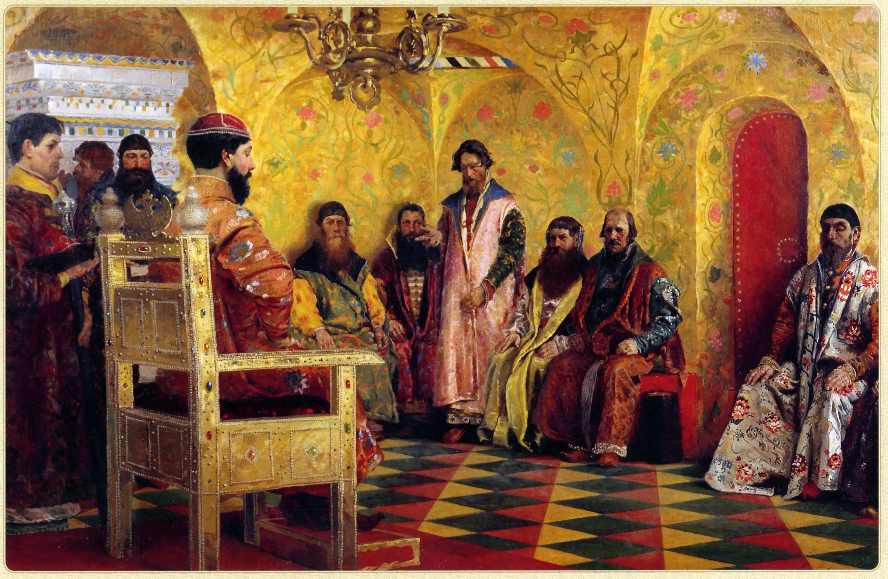 На картине изображена государева комната, в которой первый царь из династии Романовых советуется с боярами, принимая важные для государства решения. Михаил Фёдорович занял престол в годы потрясений, когда ему шёл семнадцатый год. Опираясь на родственников и “близкий круг” Романовых, он сохранил власть в условиях угрозы со стороны других претендентов.