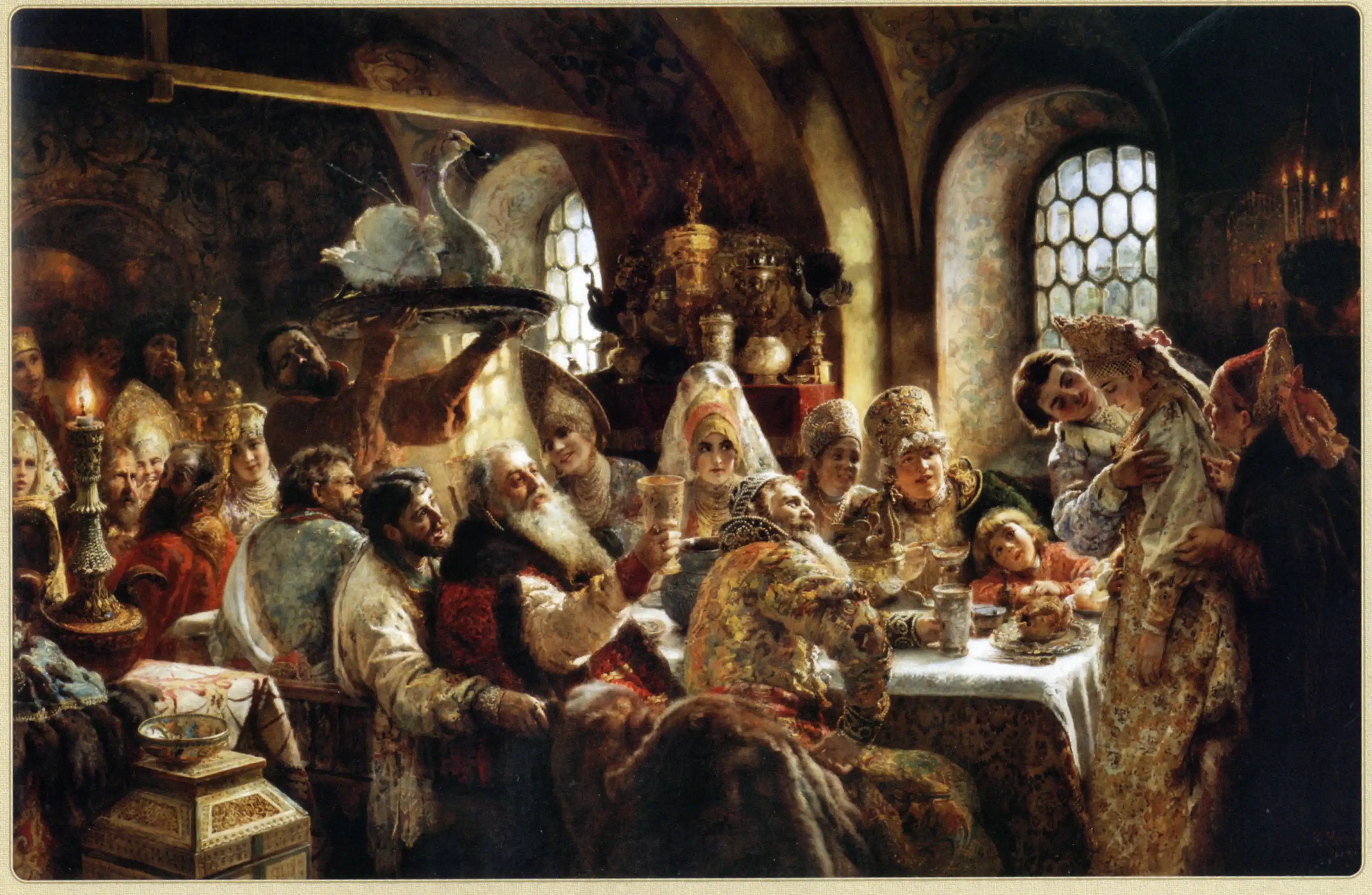 На свадебный пир отправлялись после венчания. На картине мы видим сводчатые хоромы, в которых застолье подходит к своему завершению. Художник запечатлел момент, когда пирующим приносят традиционное, завершающее торжества, блюдо – жареного лебедя.