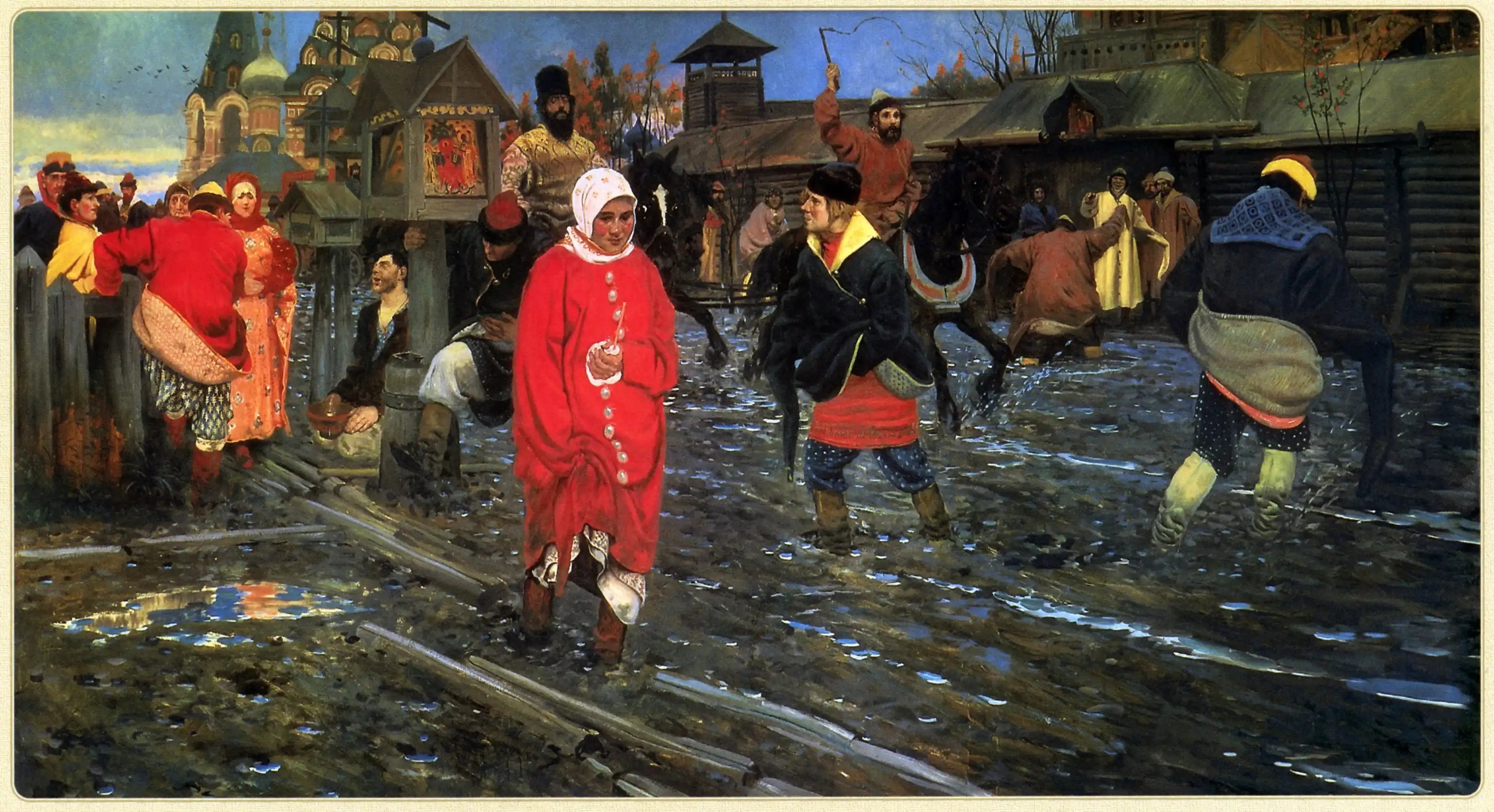 На картине - московская улица в XVII веке. Прохожие утопают в грязи – кто по щиколотку, а кто и по колено. Бревенчатый настил – “предшественник” нынешнего тротуара – под весом прохожих быстро уходит в топкую грязь. Тут уж без высоких сапог никак не обойтись.