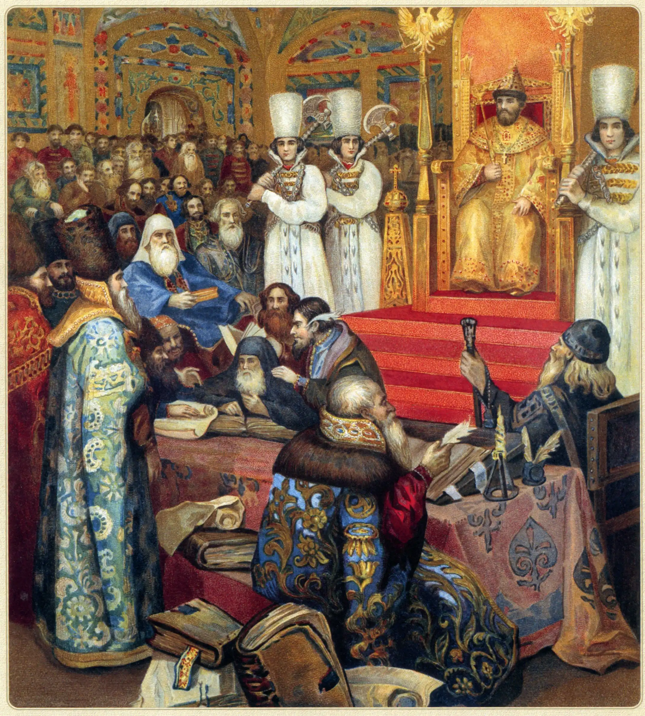 Высшие сословно-представительские учреждения, рассматривавшие общегосударственные вопросы, в XVI-XVII веках назывались “Земскими соборами”. Созывались они царём, а в его отсутствие – патриархом (до 1589 года – митрополитом) и Боярской думой. Появлению Земских соборов способствовало создание единого Русского государства, ослабление княжеской и боярской аристократии, усиление дворянства и “верхов” посада. Постоянными участниками соборов были думные чины и Освящённый собор. Привлекались к участию и представители государева двора, выборные представители от провинциального дворянства и влиятельные горожане.