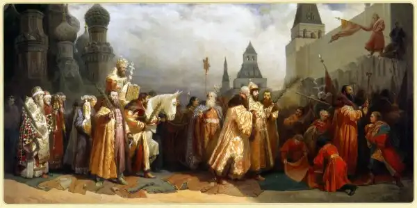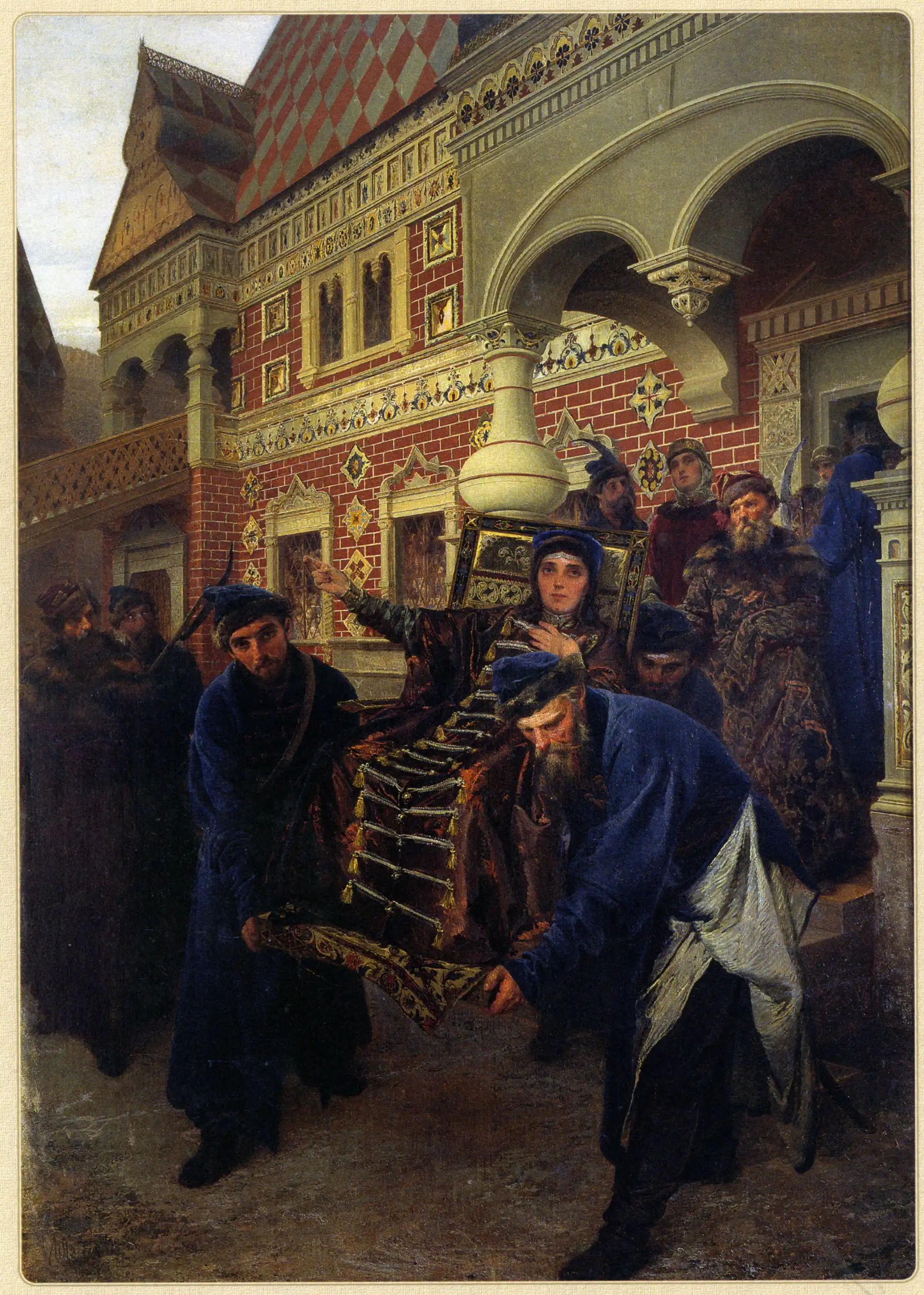 На картине – сцена из времён правления царя Алексея Михайловича, прозванного Тишайшим. Под руки его ведут двое бояр, слуги расстилают перед царём ковёр. Следом за ним на белом коне едет патриарх Никон с крестом и Библией в руках.