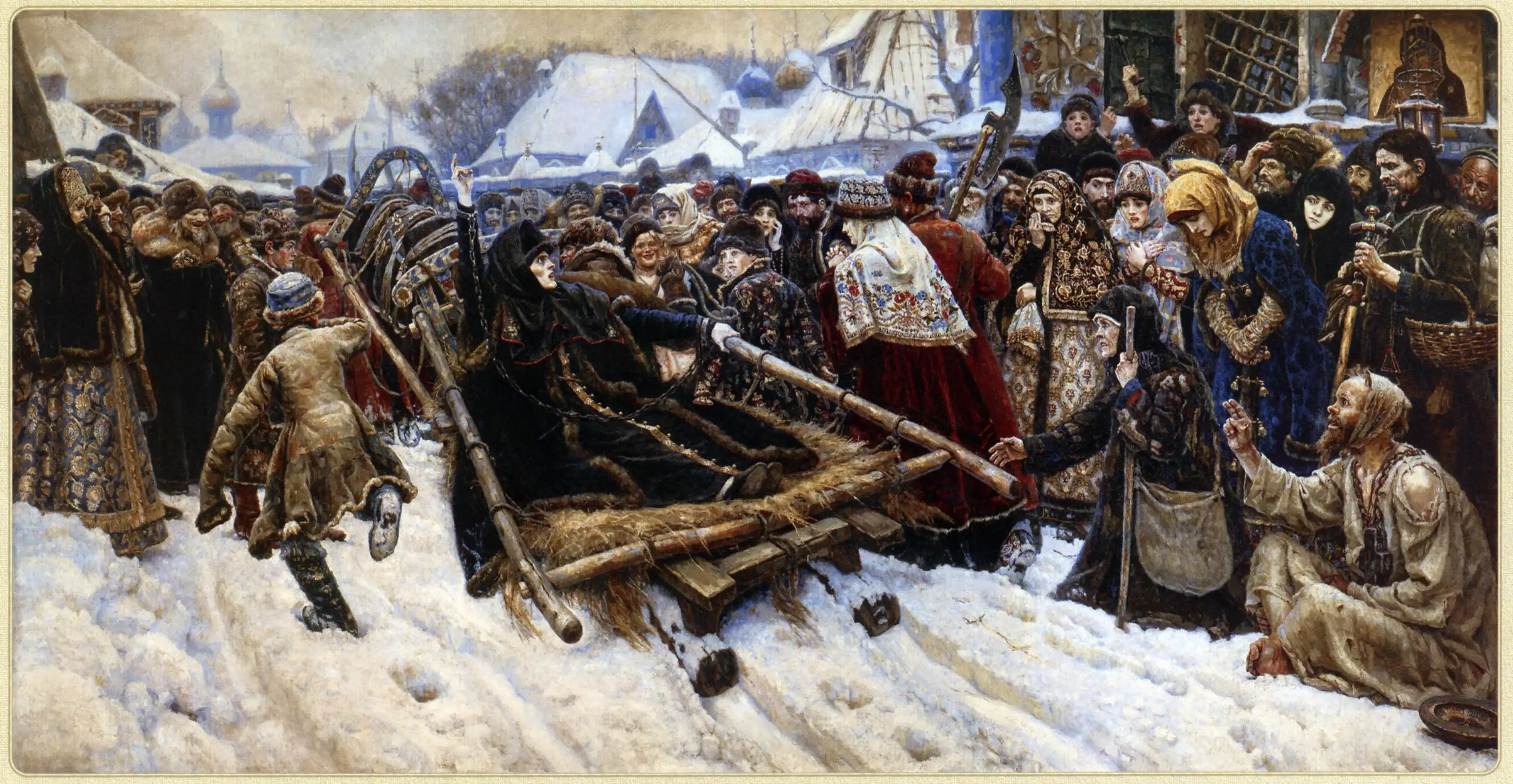 Боярыня Морозова с детства смиренно служила Богу. Ещё молодой она осталась вдовой. Была богата, но больше земных благ ценила блага духовные. Она стала ярой противницей реформ патриарха Никона. В частности, не приняла троеперстия: на картине Василия Сурикова она крестит толпу на старообрядческий манер – двуперстием.