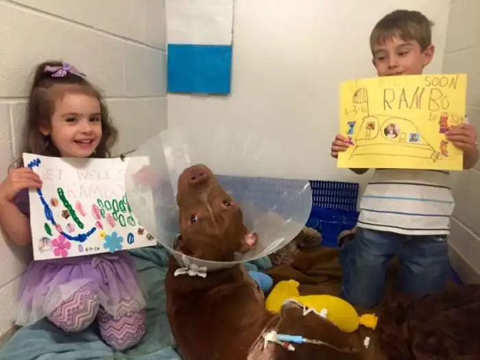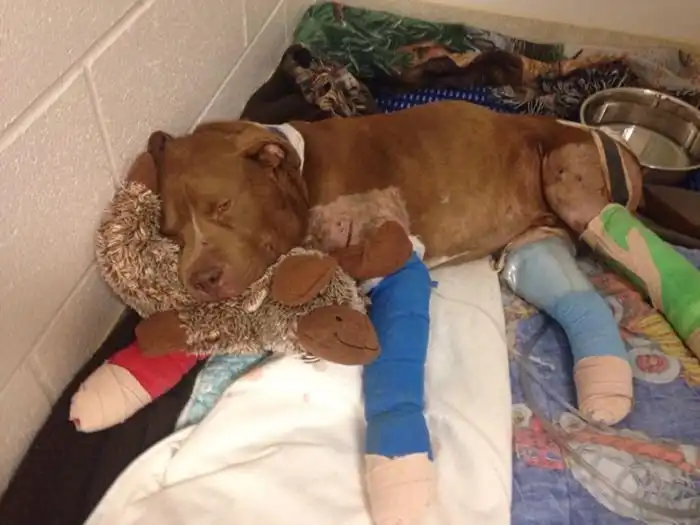 Этот несчастный питбуль был найден умирающим в окрестностях Рок-Хилла, Южная Каролина, США, и, судя по всему, его использовали в качестве собаки-приманки в собачьих боях. На теле животного было множество рваных ран и следов от укусов, в придачу ко всему началось заражение. Однако Рэмбо, как впоследствии назвали пса, был готов к борьбе за жизнь. Его доставили в клинику Baxter Veterinary Clinic, где за его спасение взялись лучшие специалисты. Сейчас Рэмбо чувствует себя гораздо лучше, однако до полного восстановления еще далеко. В то же время ветеринары отмечают, что, несмотря на всю жестокость, которую пришлось перенести этой бедной собаке, она не перестала любить людей и прекрасно находит с ними общий язык.