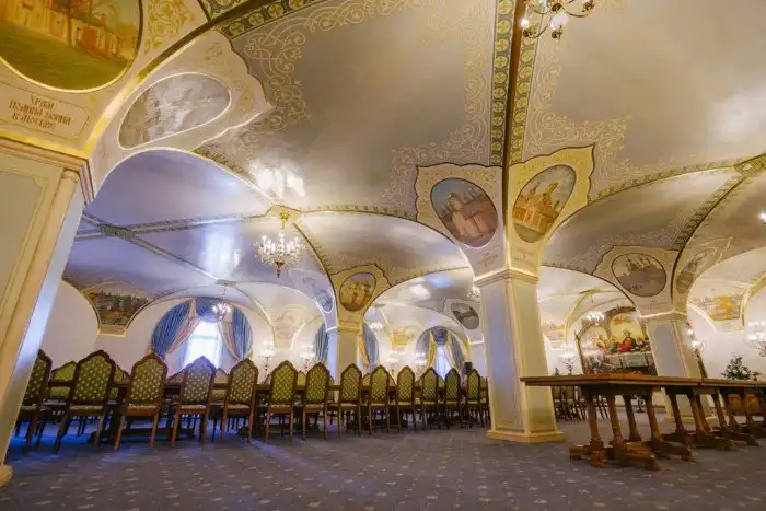 В трапезных палатах, которые рассчитаны на полторы тысячи мест, проходят трапезы участников Поместных и Архиерейских Соборов, различные праздничные приемы духовенства.