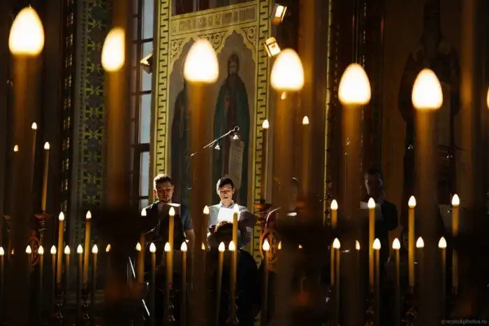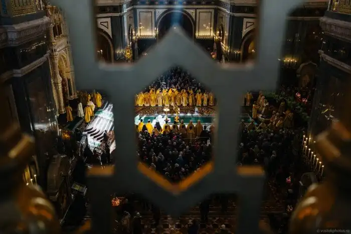 Вид с хоров. Съемка проводилась во время Патриаршего богослужения 1й недели Великого поста. Особую торжественность службе придал тот факт, что она проходила на 40-ю годовщину Архиерейской хиротонии Святейшего Патриарха Московского и всея Руси Кирилла.