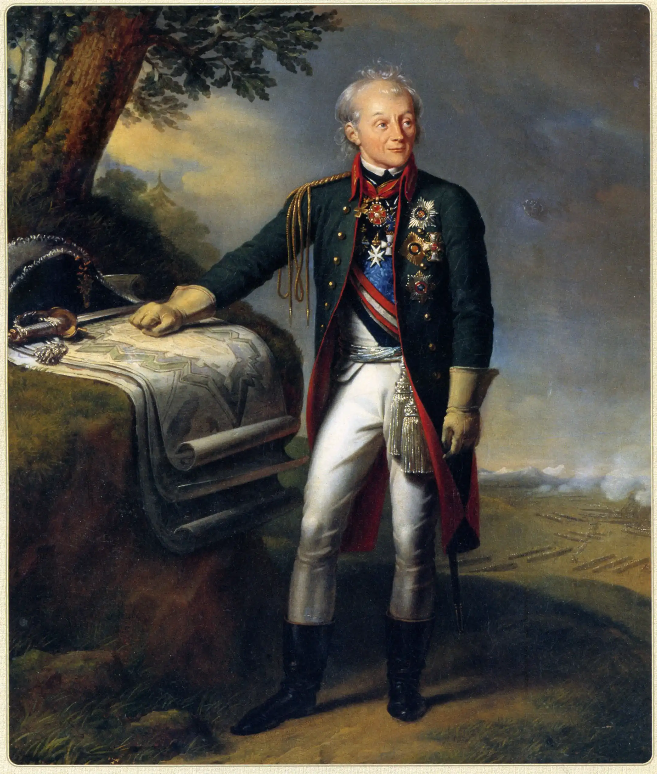 Вот он в левой части картины: объясняет боевым соратникам, почему нужно поступить именно так. Ближе всех к Кутузову сидит Барклай-де-Толли. Он был главнокомандующим русской армией до Кутузова и был отстранён от командования Александром I из-за стратегии “постоянного отступления”.