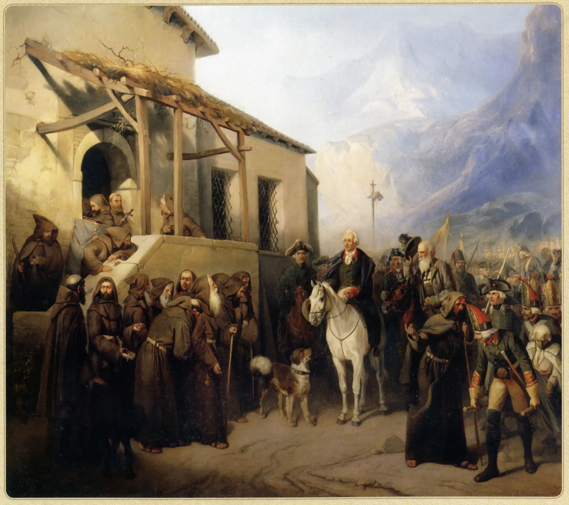 …Только что русские солдаты совершили героический переход через перевал Сен-Готард и разгромили французов. И вот идут мимо монастыря францисканцев.