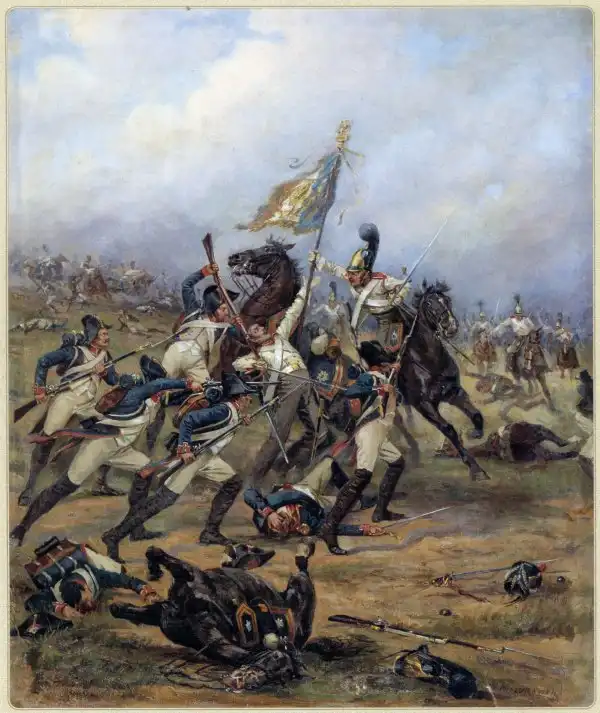 В сражении при Аустерлице отличилась русская гвардейская кавалерия. Два эскадрона конногвардейцев опрокинули батальон 4-го линейного полка французов. На картине показано, как двое русских конногвардейцев добывают важный трофей – французское знамя. Но всё же Аустерлицкое сражение выиграл Наполеон. Австрийцы, решив, что продолжать войну с французами бессмысленно, на правах побеждённых заключили с Францией мирный договор.