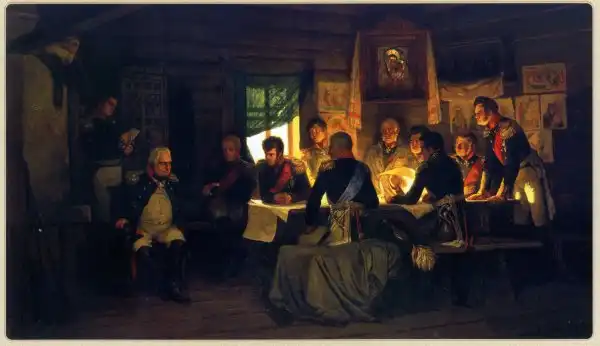 В русской избе собрались генералы во главе с командующим армией Кутузовым. Они решали, как им дальше воевать с Наполеоном. Разговор был горячим, звучали самые разные предложения, но все понимали: окончательное решение остаётся за командующим. Михаил Илларионович сказал: “Оставив Москву, мы сохраним армию, потеряв армию, мы потеряем и Москву, и Россию”.