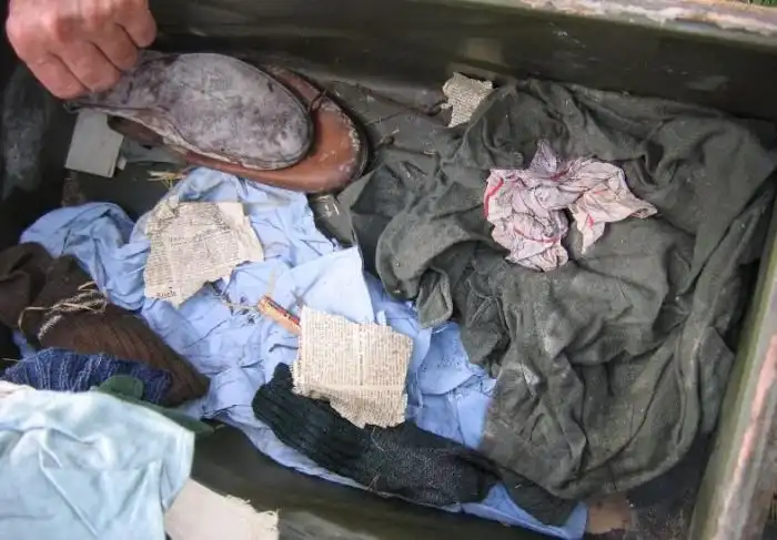 Перед вами небольшой схрон времен Великой Отечественной войны, который был обнаружен одним поисковым отрядом. В небольшом металлическом ящике лежало не оружие и боеприпасы, как это обычно водится, а гражданские вещи, военная форма, сигары и спиртное.