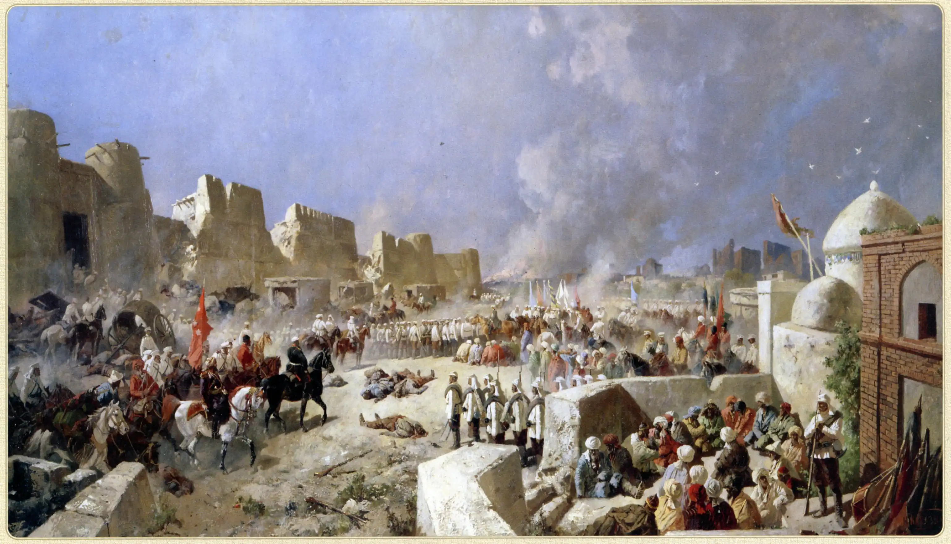 После отказа эмиром подписать российско-бухарское соглашение, возглавивший созданное Туркестанское генерал-губернаторство, генерал-лейтенант Константин Петрович Кауфман занял второй по значению город эмирата – Самарканд. Оставив в городе малочисленный гарнизон, в составе которого был и прапорщик Василий Верещагин, Кауфман направился к Зерабулакским высотам, где разгромил бухарскую армию. В тот же день в Самарканде вспыхнуло восстание, охватившее весь город, и русский гарнизон оказался запертым в местной цитадели.
