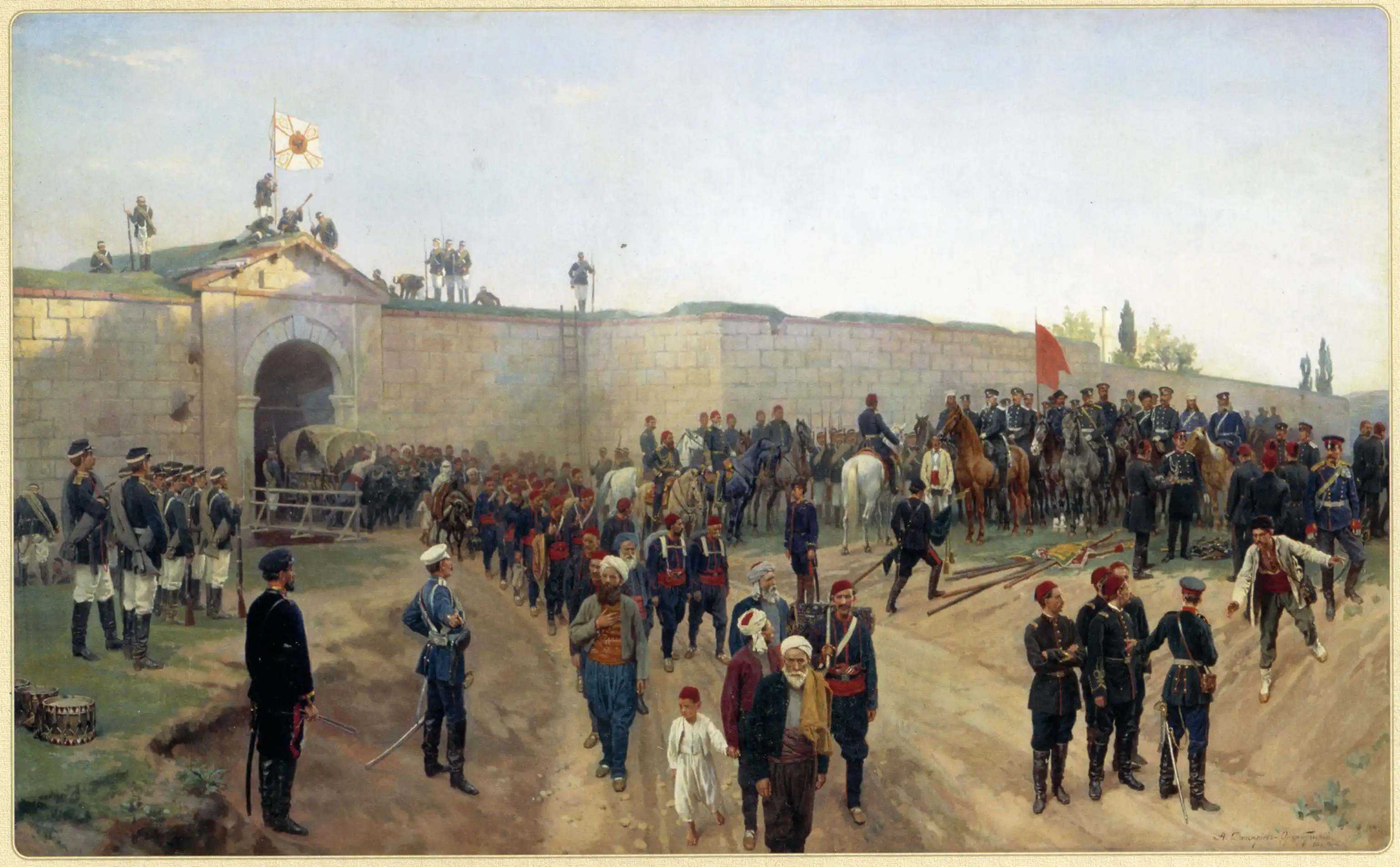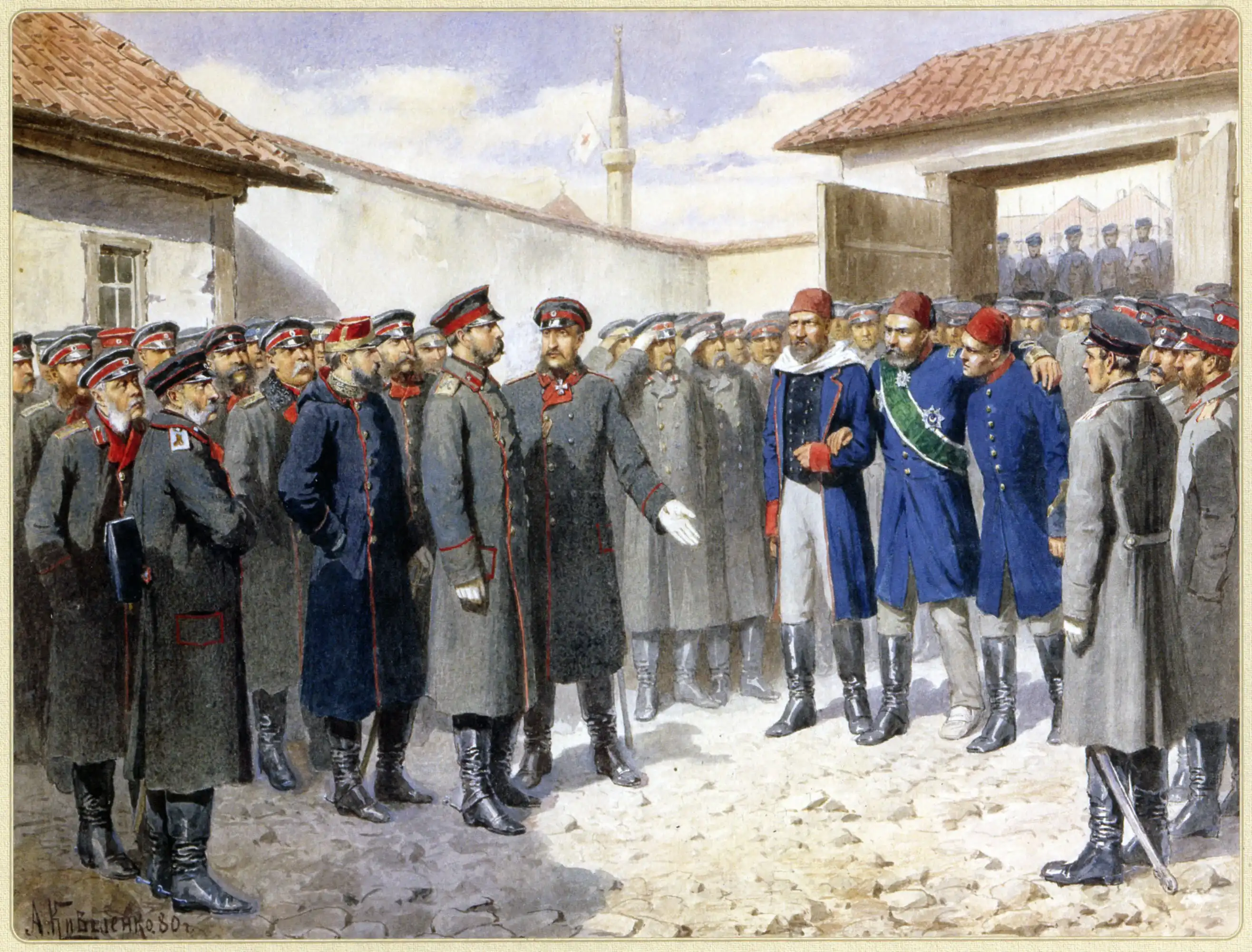 Изображённые на картине события произошли днём позже сдачи турецкой армии в плен. Сутки Осман-паша был без сабли, которую вернул ему Александр II лично, а вечером маршал отправил в Стамбул телеграмму: “…полтора месяца мы находились на осадном положении. Не получив с тех пор никакой помощи, я решился пробиться со всей армией сквозь ряды русских войск… Теперь нахожусь военнопленным вместе со всем плевненским гарнизоном. Оценив храбрость моих солдат, его императорское величество и его августейший брат удостоили меня самым благосклонным приёмом…”