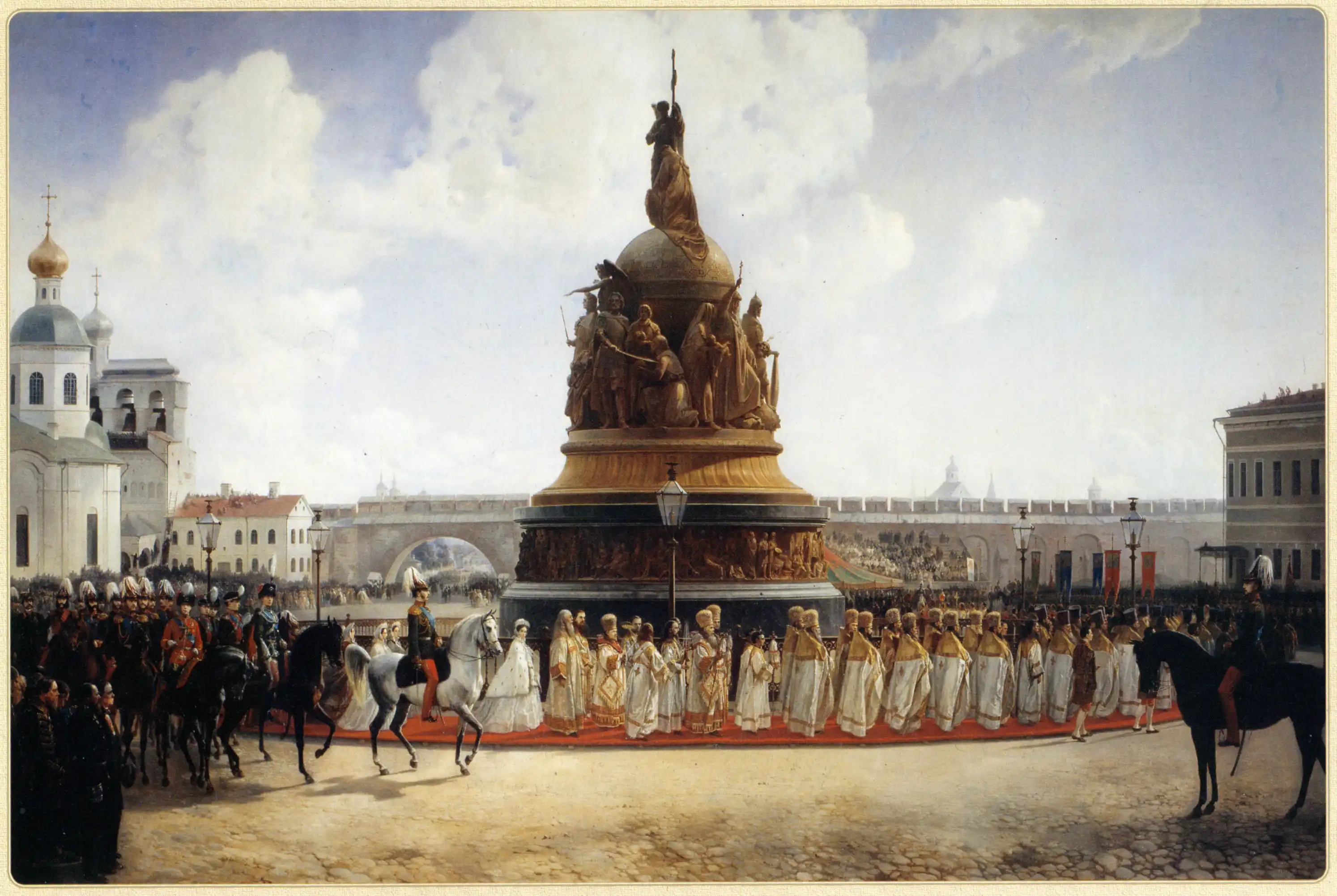 На этом живописном полотне изображено освящение замечательного памятника русской истории. Он установлен в Новгороде Великом и называется “Тысячелетие России”. Памятник был открыт в 1862 году: согласно летописи в 862 году в Новгород прибыл князь Рюрик, который стал основателем первой русской правящей династии – Рюриковичей.