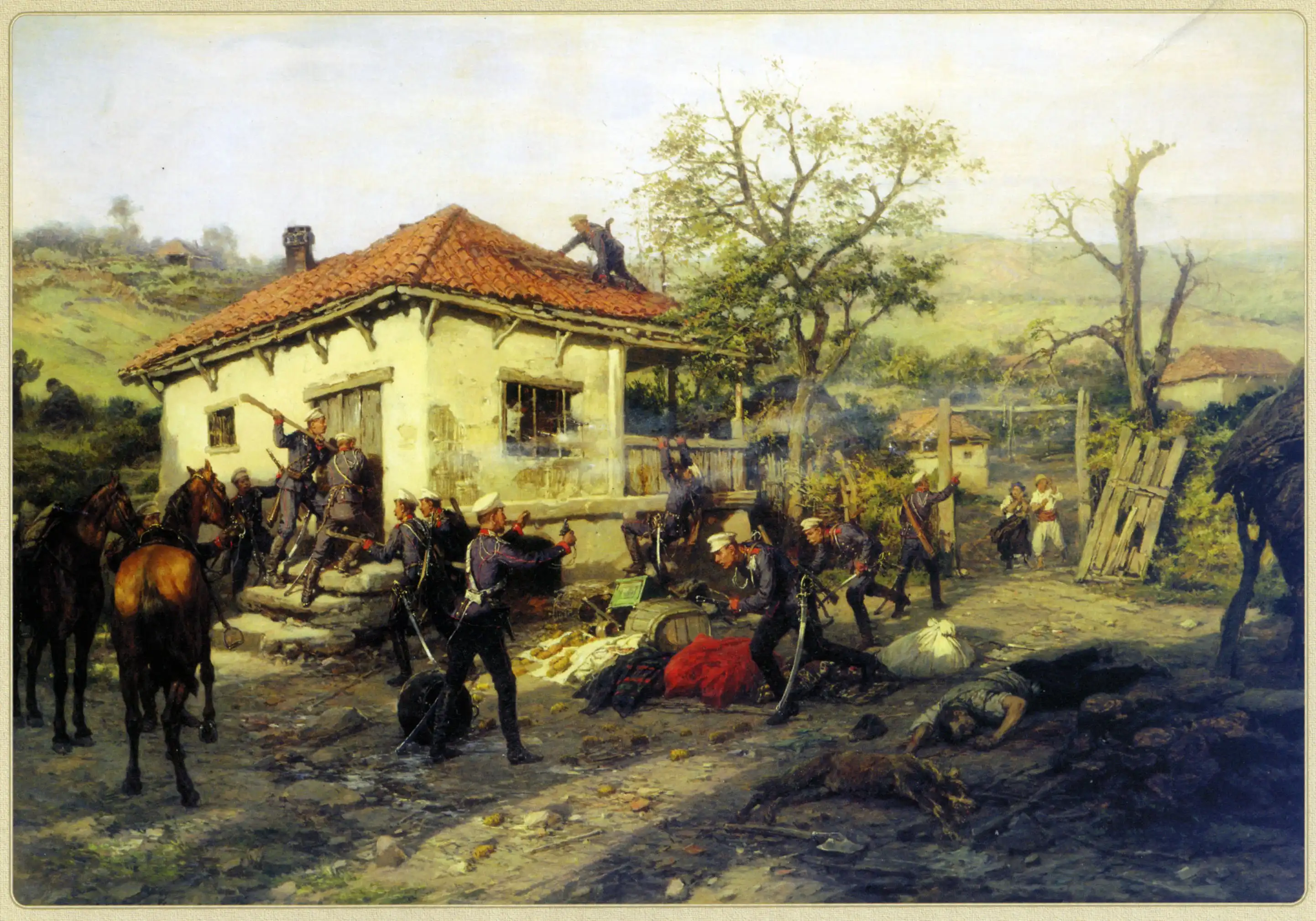 На картине изображён один из эпизодов этой войны. Турки выгнали болгар из дома, укрепились там и стали отстреливаться от наступавших. Несчастные хозяева стоят у раскрытых ворот: они безоружны и не в силах противостоять врагам.