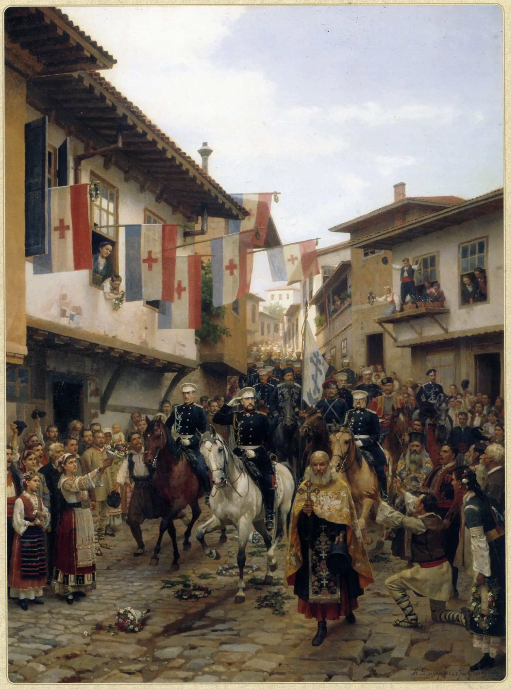 Русские войска вступают в освобождённую ими от турок древнюю столицу Болгарии город Тырново (ныне Велико-Тырново). Первым идёт священник с православным крестом. За ним на белом коне следует командующий армией великий князь Николай Николаевич Старший – брат Александра II. Он отдаёт честь жителям города. Дальше среди всадников видны казаки и болгарские повстанцы, которые участвовали в освободительной борьбе.