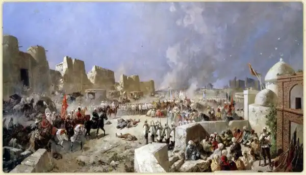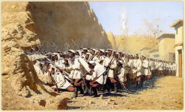 Бухарский эмират – государство в Средней Азии, основанное в 1753 году эмирами династии Мангыт на территории Бухарского ханства. (Впоследствии эмиры Бухары имели чины генералов русской армии и награждались высшими орденами Российской империи.) На картине В.В. Верещагина изображена осада русского гарнизона в Самарканде в 1868 году.