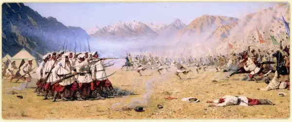 Во второй половине XIX века Россия расширяла границы, распространяя своё влияние на Среднюю Азию. В ходе Бухарских походов 1866-1868 годов и в 1870-х годах к Российской империи на правах вассального (зависимого) государства был присоединён Бухарский эмират (территория современного Узбекистана). Перед нами – одна из картин туркестанской серии, написанной художником В.В. Верещагиным. На ней горстка русских солдат обороняется от целой армии туркестанцев.