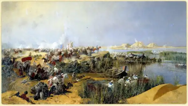 Чтобы подойти к Хиве, русским войскам надо было переправиться через реку Аму-Дарью. Один из участников этого похода – писатель, будущий генерал-майор и временный Тифлисский губернатор, а пока ротмистр Максуд (Александр Михайлович Алиханов-Аварский – описал эти события: “Безжизненный противоположный берег тянулся узкою, песчаною полосой… Около часа дорога тянулась по открытому берегу и затем опять повернула в камыши. Здесь авангард наш снова увидал людей, но на этот раз прямо против себя: по дороге галопировали, удаляясь от нас, отдельные всадники, а по сторонам в камышах целыми сотнями мелькали чёрные туркменские шапки. Наконец-то неприятель!”