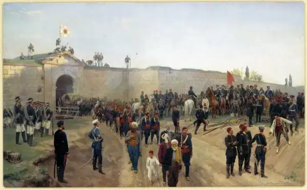 Художник Николай Дмитриев-Оренбургский запечатлел на картине сдачу турками крепости Никополь.