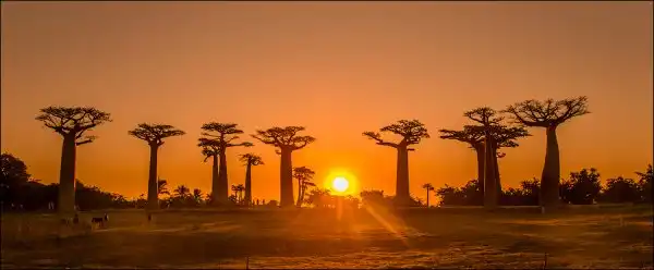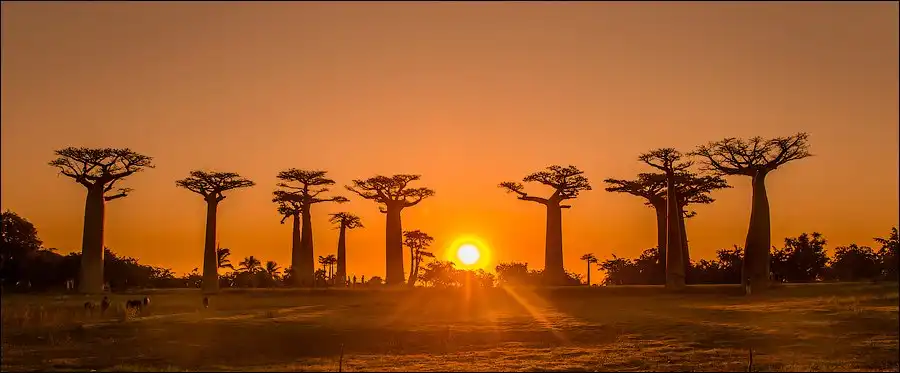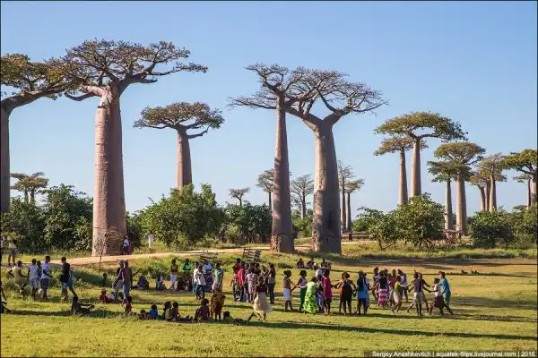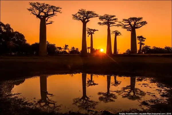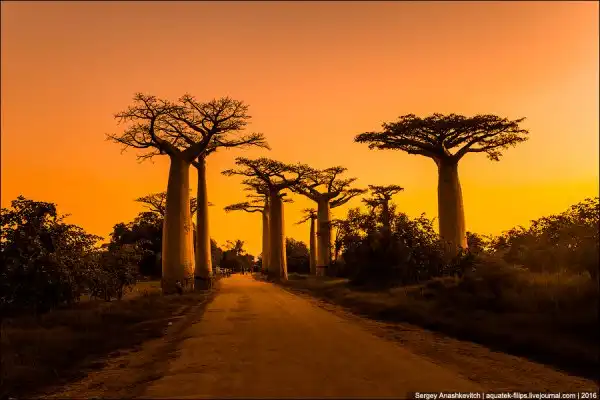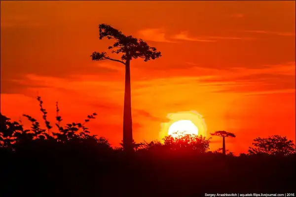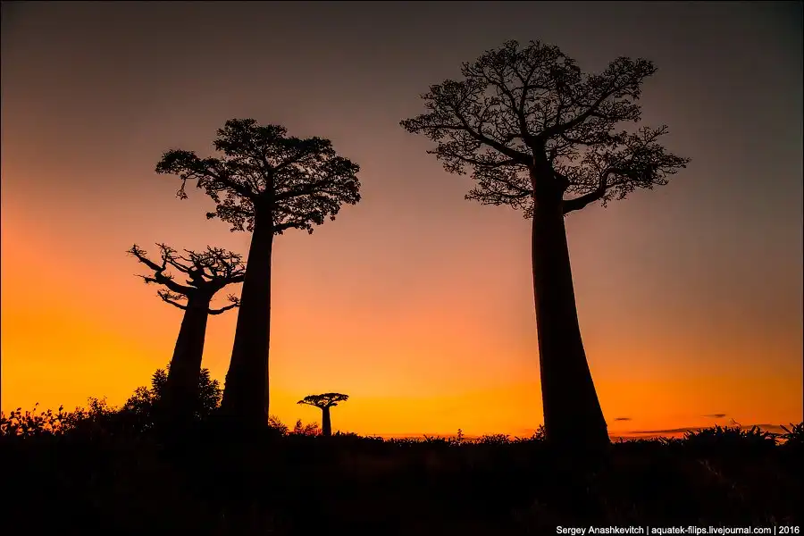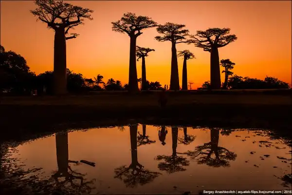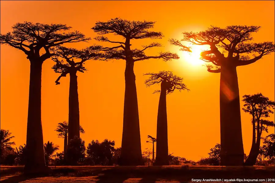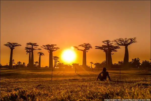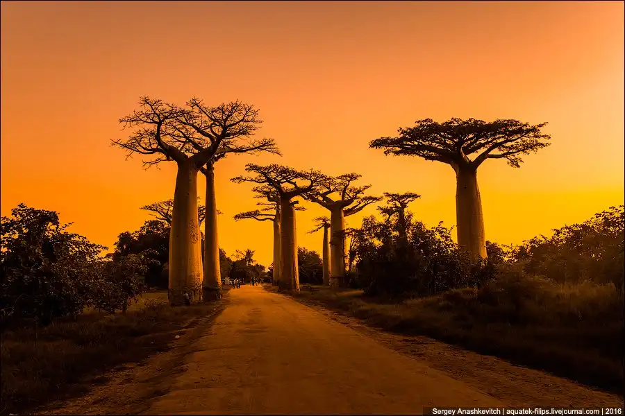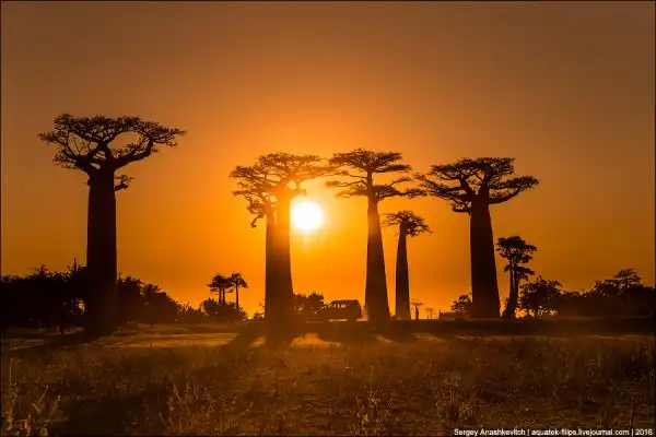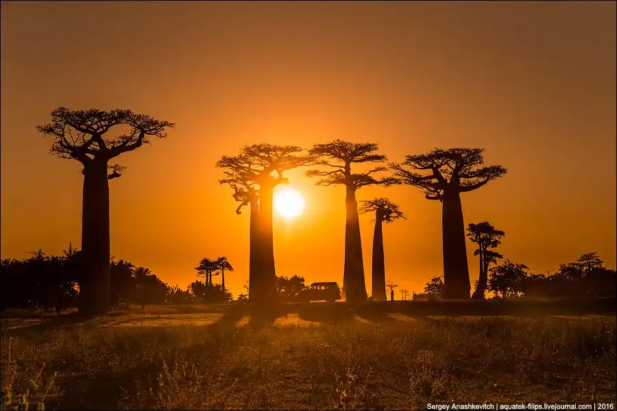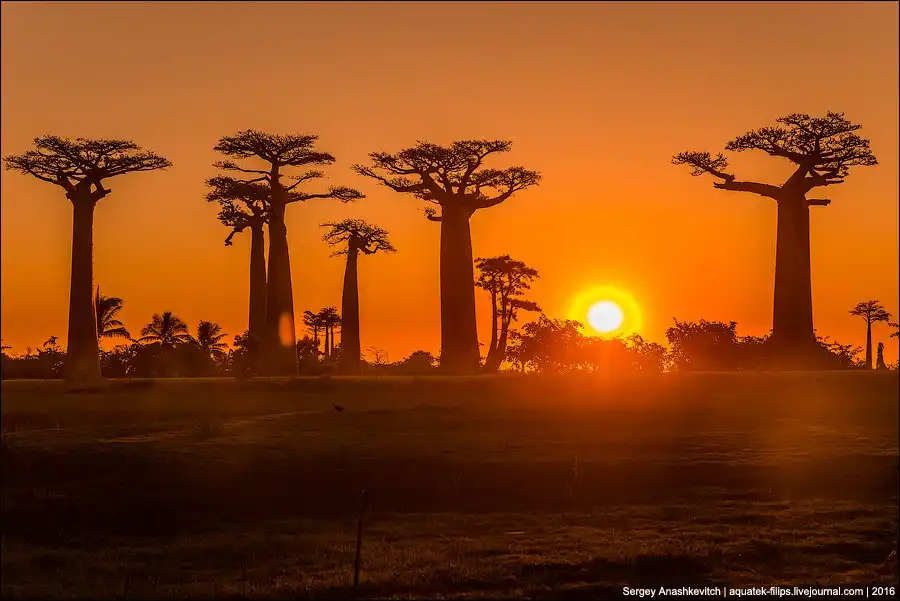 Мы приехали сюда за несколько часов до заката. Едва выбравшись из пыльных джипов, тут же разбежались с жадностью фотографировать, то, к чему добирались на протяжении последней недели путешествия. Нет, конечно, можно было сразу прилететь из Антананариву в Морондаву на самолете, но… мы поступили интереснее. Ехали через деревни на автобусе, три дня сплавлялись по реке Тцирибихина, два дня ехали на джипах по убитым дорогам среди джунглей. И вот… наконец-то баобабы!