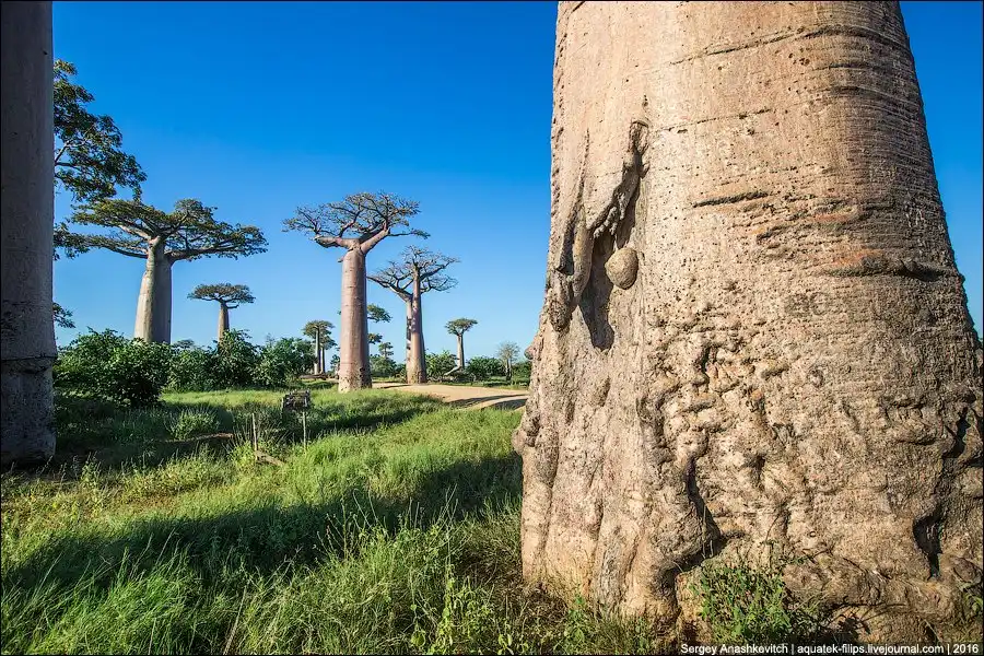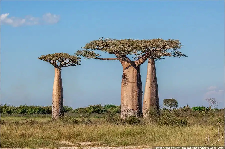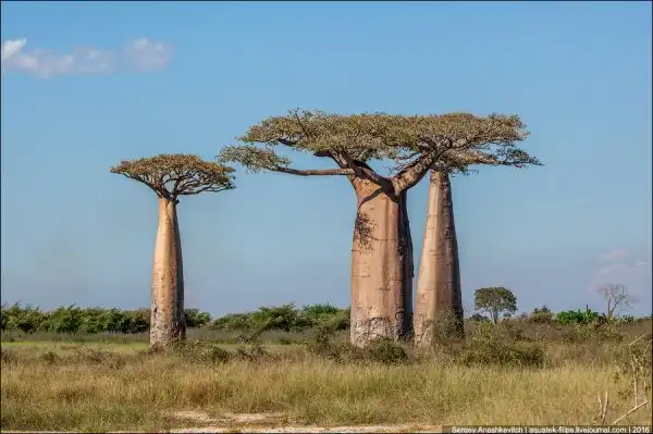 Баобаб, в основном, растет на Мадагаскаре, являясь даже символом острова. В других странах Африке и Австралии есть еще несколько видов баобабов, но такие, похожие на бутылки, растут только здесь. Одним из самых известных мест произрастания этого дерева стала грунтовая дорога между городами Belon’i Tsiribihina и Morondava в регионе Менабе на западе Мадагаскара, которую называют Аллеей Баобабов. Когда-то здесь были густые тропические леса, покрывавшие весь остров, но … человек вырубил значительную их часть, изменив Мадагаскар до неузнаваемости. И лишь баобабы остались возвышаться над теперь уже саваннами.