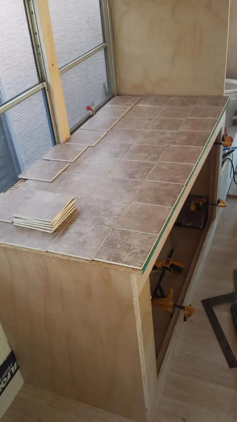 Кухонный столик они сами сделали из дерева и положили на него плитку